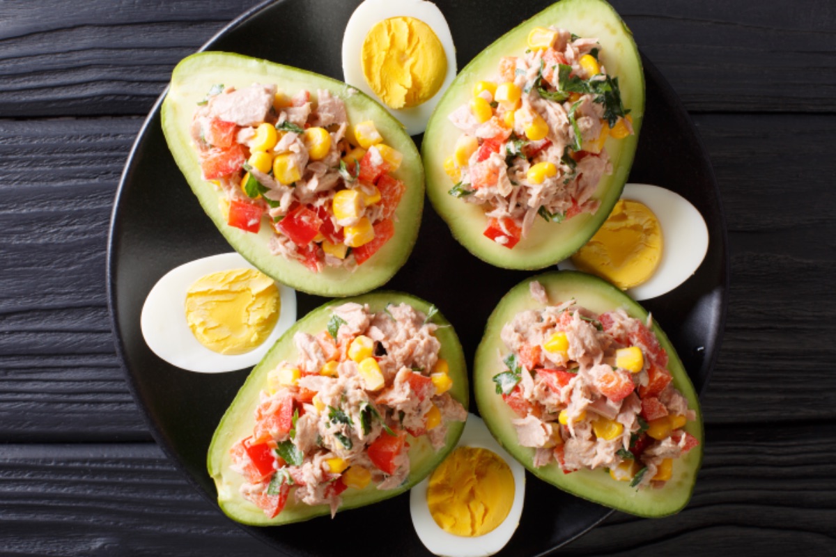 Des avocats frais farcis d'une salade de thon colorée et savoureuse, accompagnés d'œufs durs.