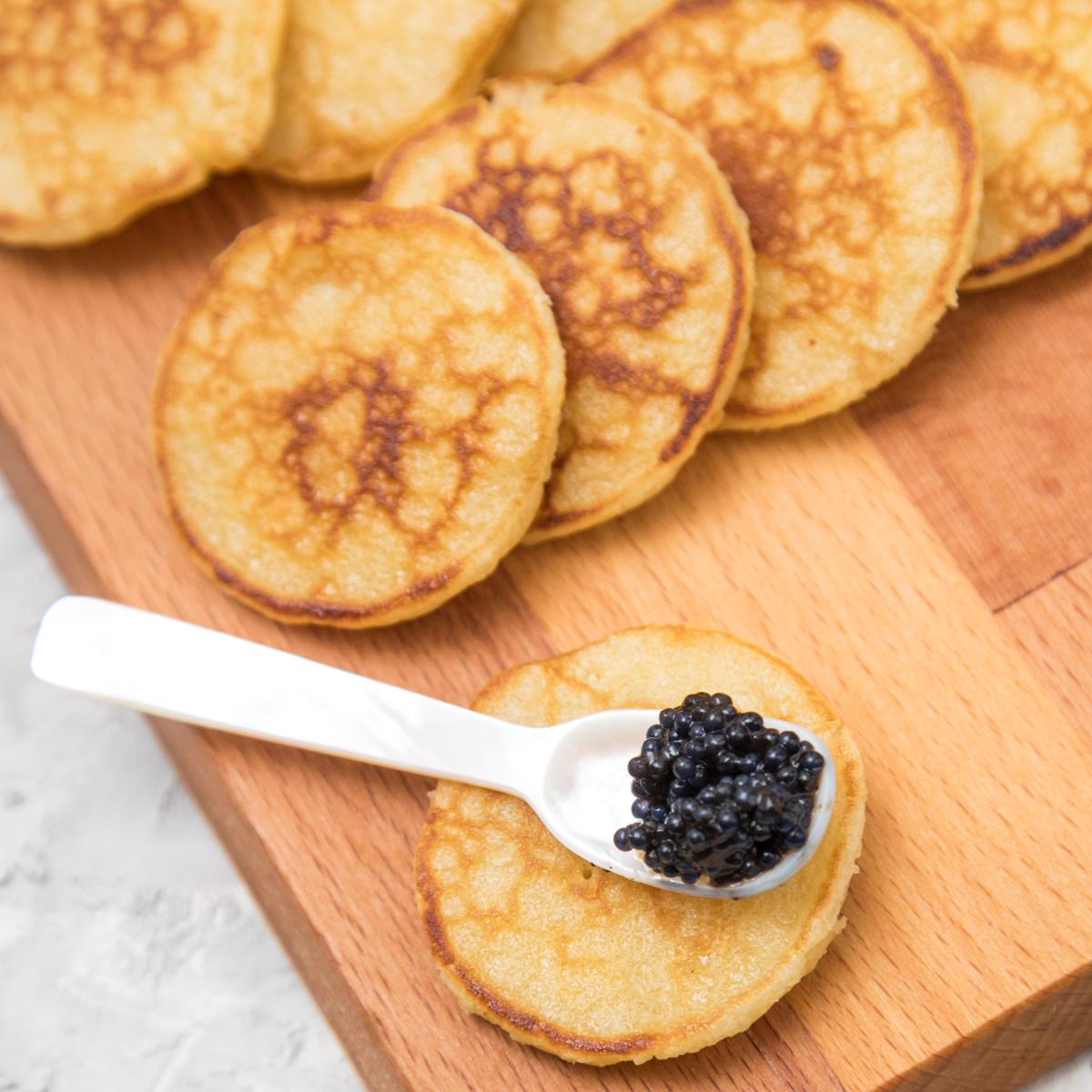 - 6Servir les blinis tièdes avec une cuillerée de caviar sur le dessus.