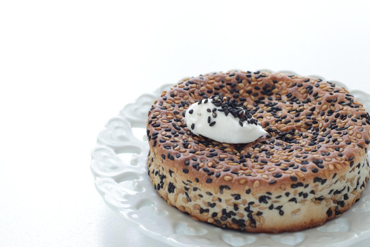 Un gâteau moelleux garni de graines de sésame noires et blanches, parfait pour le dessert ou le goûter.