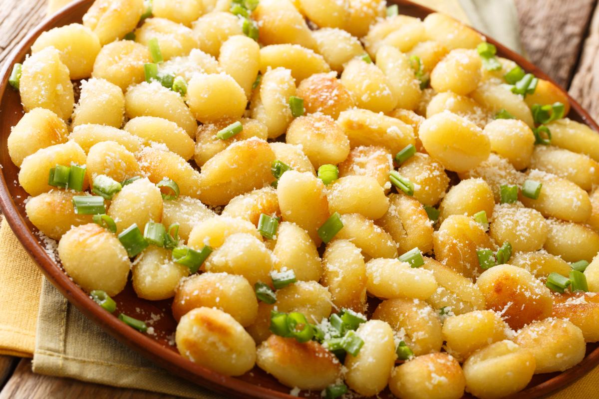 Des gnocchis dorés à la poêle, garnis de parmesan râpé et de ciboulette fraîche.