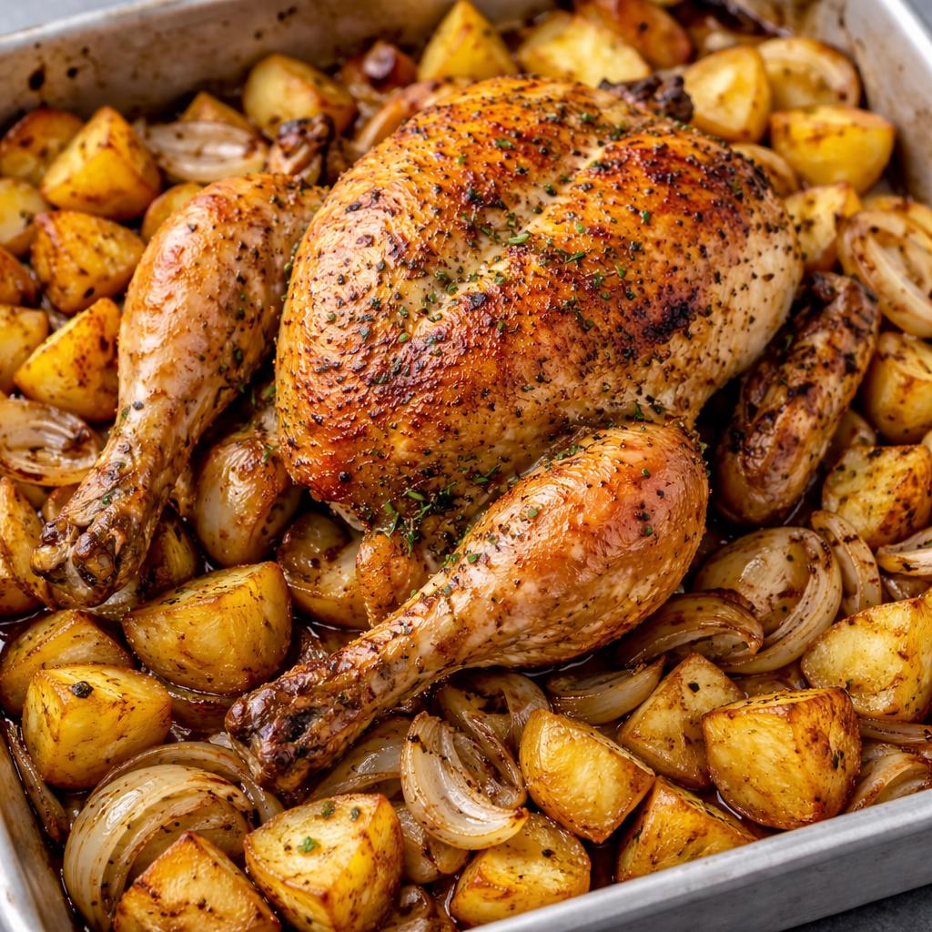 Un poulet rôti juteux accompagné de pommes de terre dorées et d'oignons caramélisés.